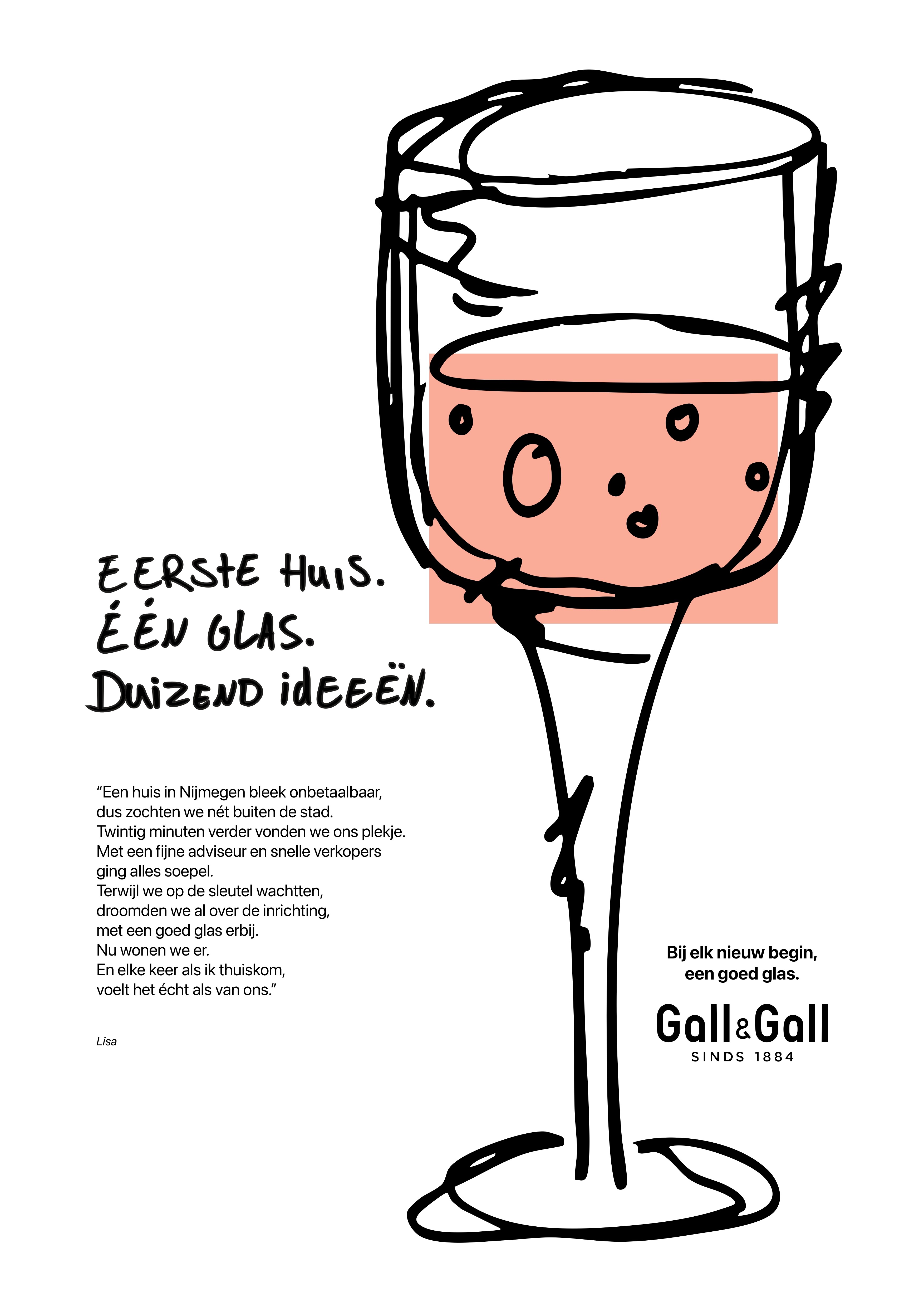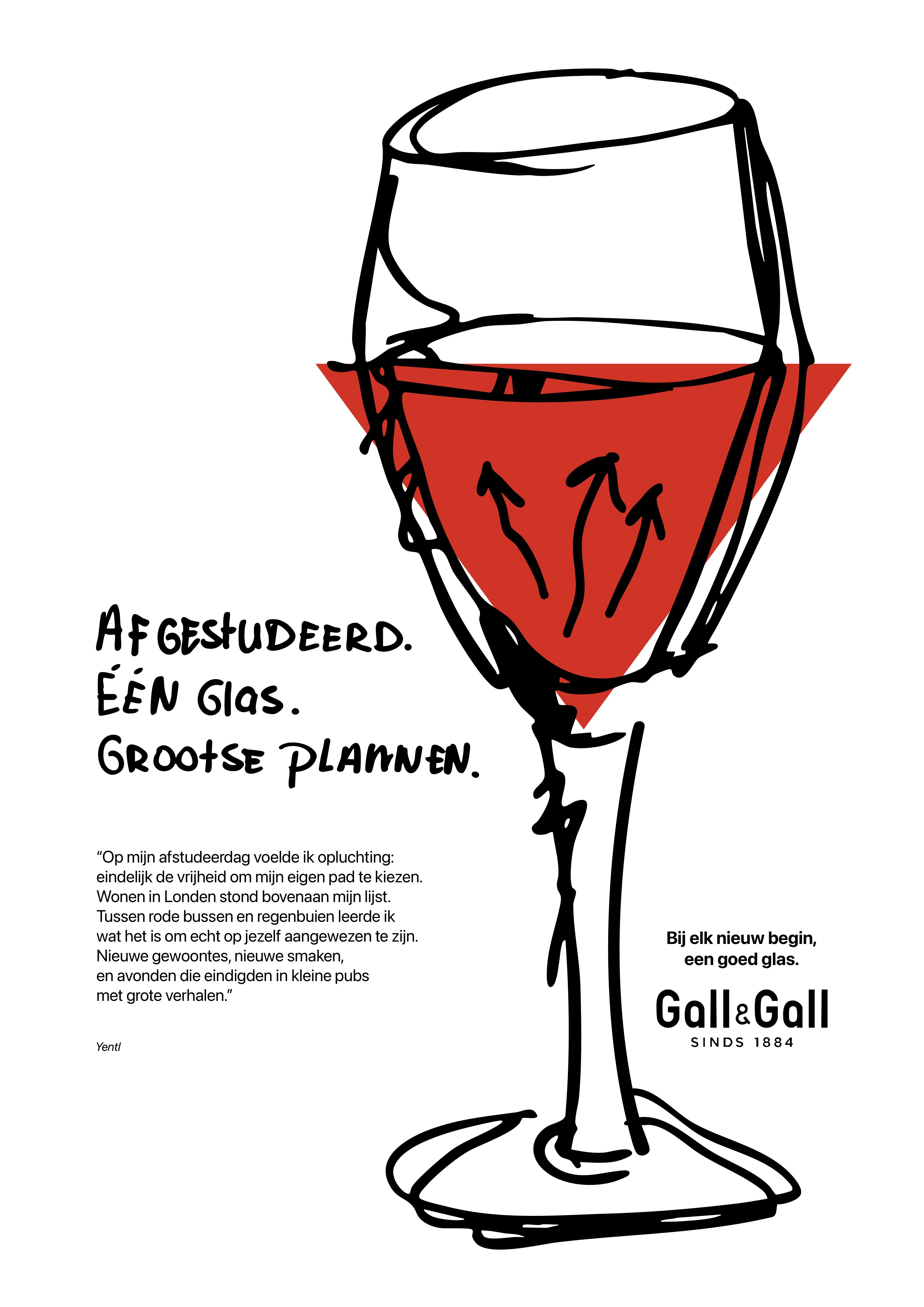 This fictional campaign celebrates the small and big moments when life changes: moving house, graduating, falling in love, or starting a new chapter. These are stories of real people, filled with recognition, warmth, and personal growth. Gall & Gall is there for those moments as a quiet companion. A good glass to pause with, to toast and to create memories.