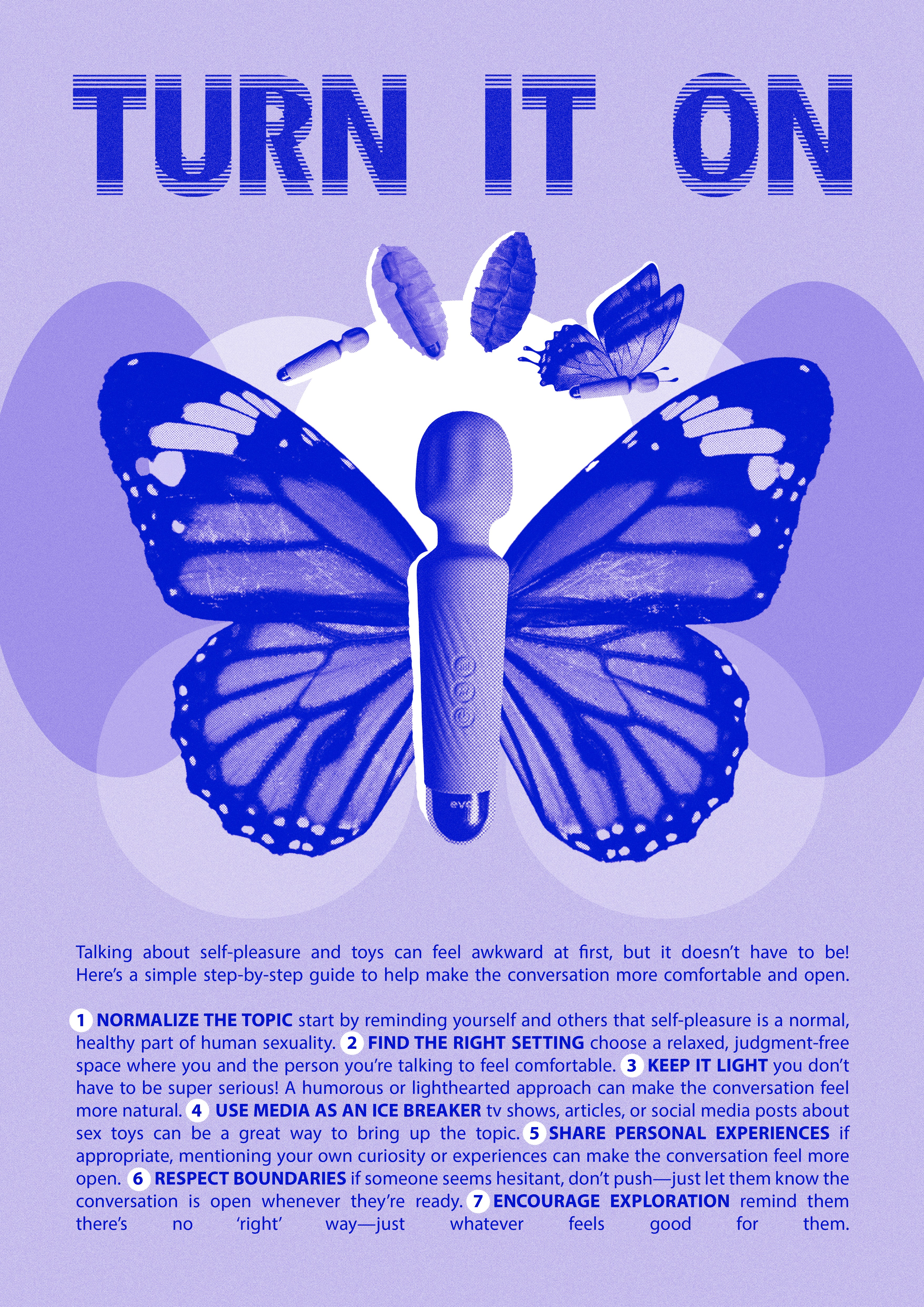 This experiment explores the development of a visual language based on an unconventional object to address the taboo surrounding self-pleasure. Through product photography, visual connections, and an infographic, the project uses color, symbolism, and transformation as metaphors for openness and conversation around sexuality.